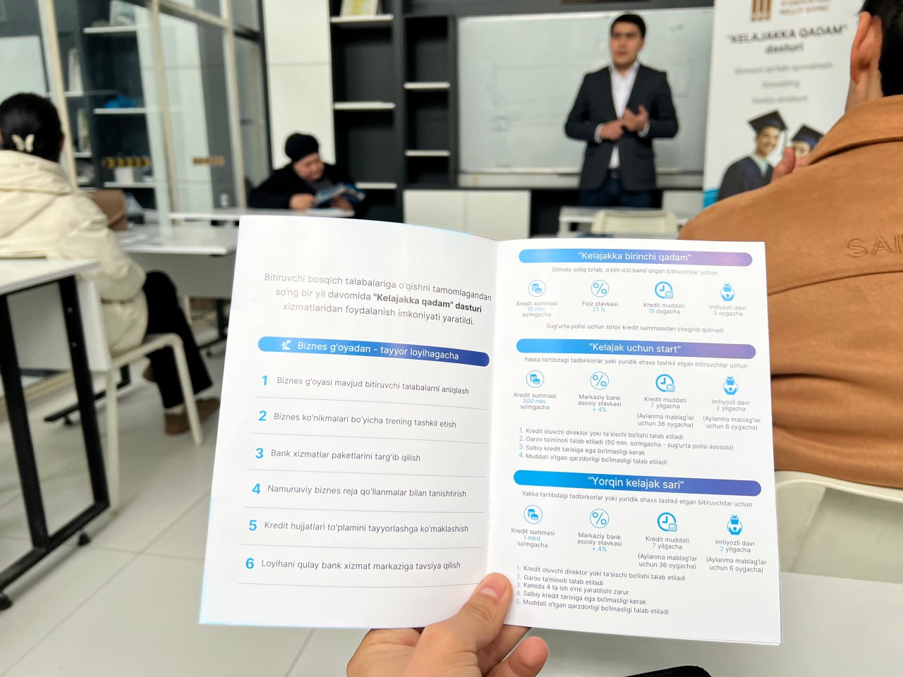 Uchrashuvda bitiruvchilarga O'zbekiston Respublikasi Prezidentining PQ-61-son (https://www.lex.uz/uz/docs/-7386917) hamda PQ-328-son (https://lex.uz/uz/docs/-7808442) (PQ-61-son qaroriga o'zgartirish va qo'shimchalar kiritish to'g'risidagi) qarorlari — bitiruvchilarga kredit olish jarayoni, talab qilinadigan hujjatlar va amaliy tartib bosqichma-bosqich tushuntirib berildi.